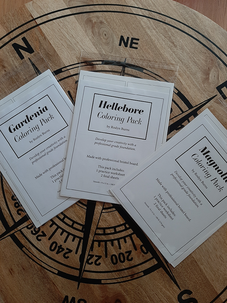 Roslyn's hand curated coloring packs help you take florals to another level. First, she hand draws each floral composition and then digitizes them and prints them on professional grade art paper.