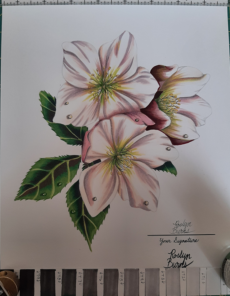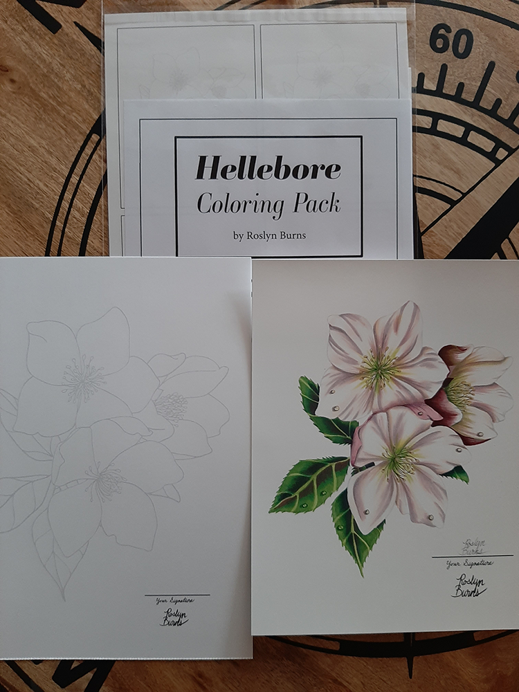 This finished Hellebore sheet was colored using Copic Alcohol Ink markers and Prismacolor colored pencils.