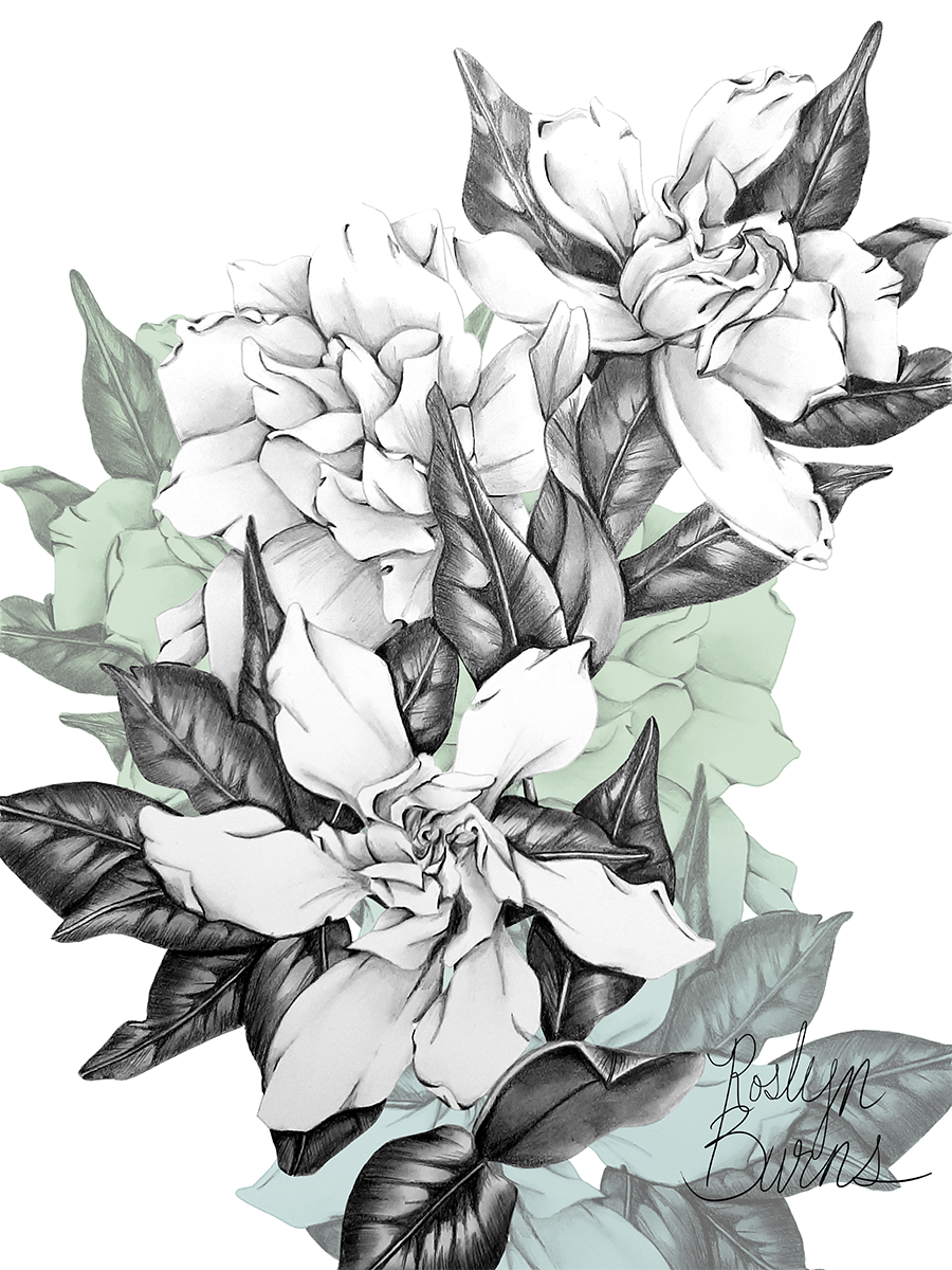 Her plant subjects are first hand drawn and then digitized. She often combines elements of hand drawn images and digital coloring in the development of her work. Some of the color themes have cultural subtext such as the Gardenias in Haint Blue to the left.